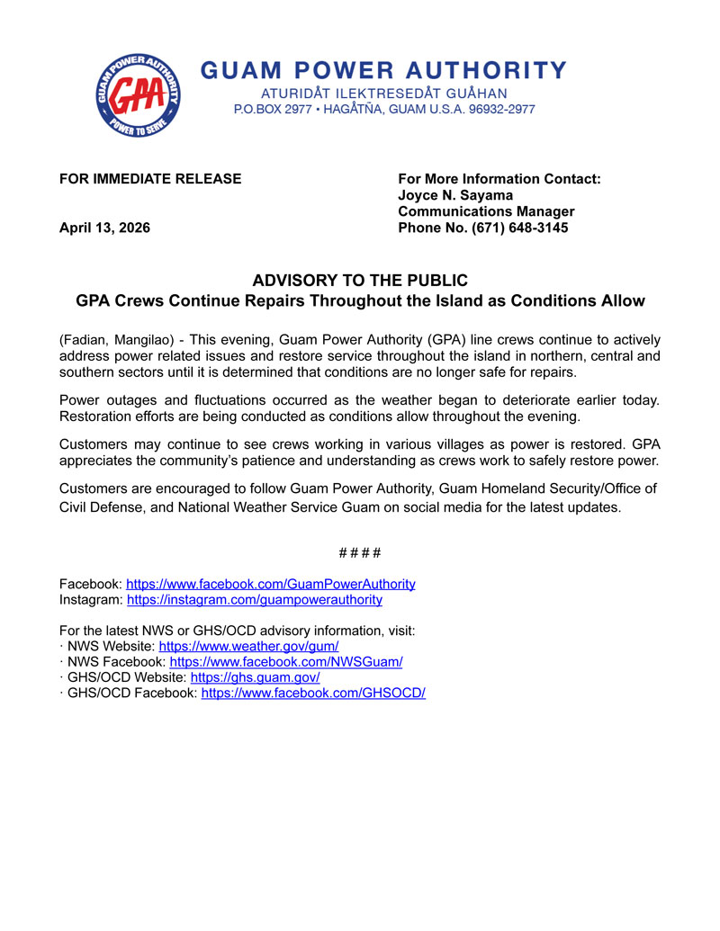 Advisory to the Public - GPA Crews Continue Repairs Throughout the Island as Conditions Allow (Final) r1