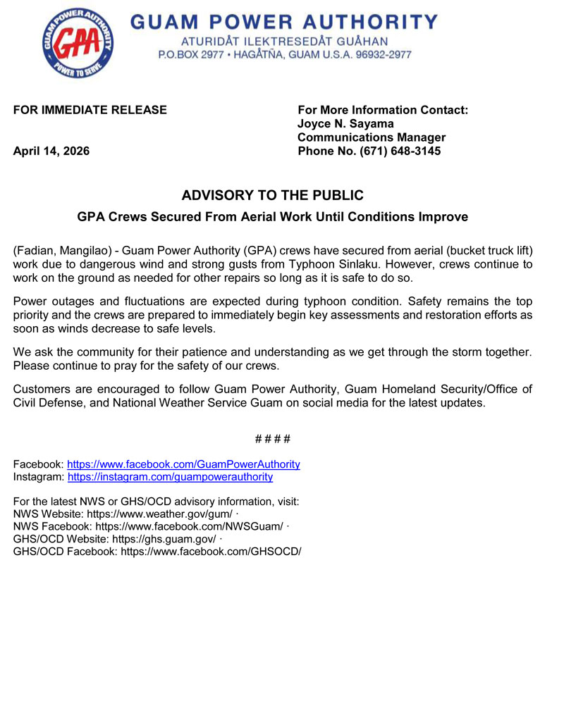 ADVISORY TO THE PUBLIC - GPA Crews Secured From Aerial Work Until Conditions Improve