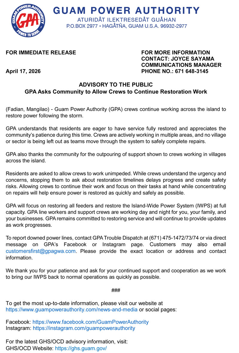GPA Advisory to the Public -GPA Asks Community to Allow Crews to Continue Restoration Work