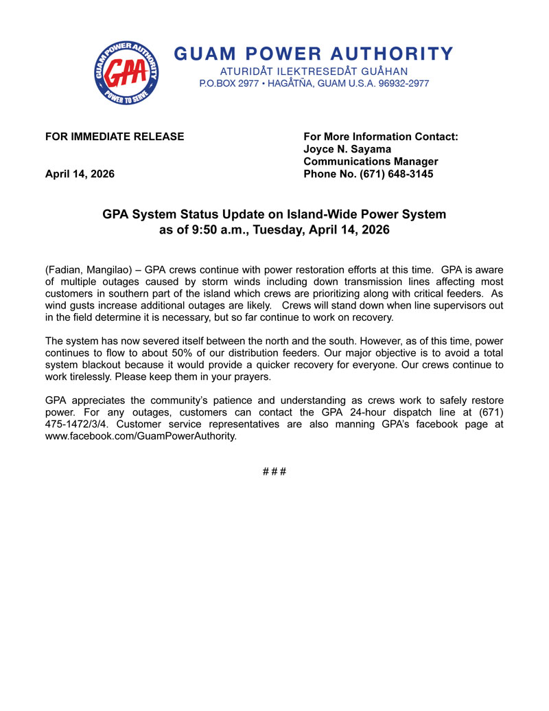 GPA Media Release - GPA System Status Update on IWPS as of 9:50 am on Tuesday, April 14, 2026