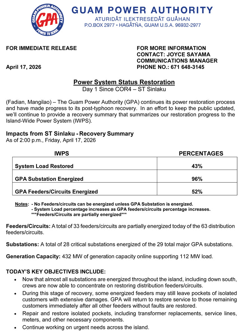 GPA Media Release: Power System Status Restoration - Day 1 since COR4
